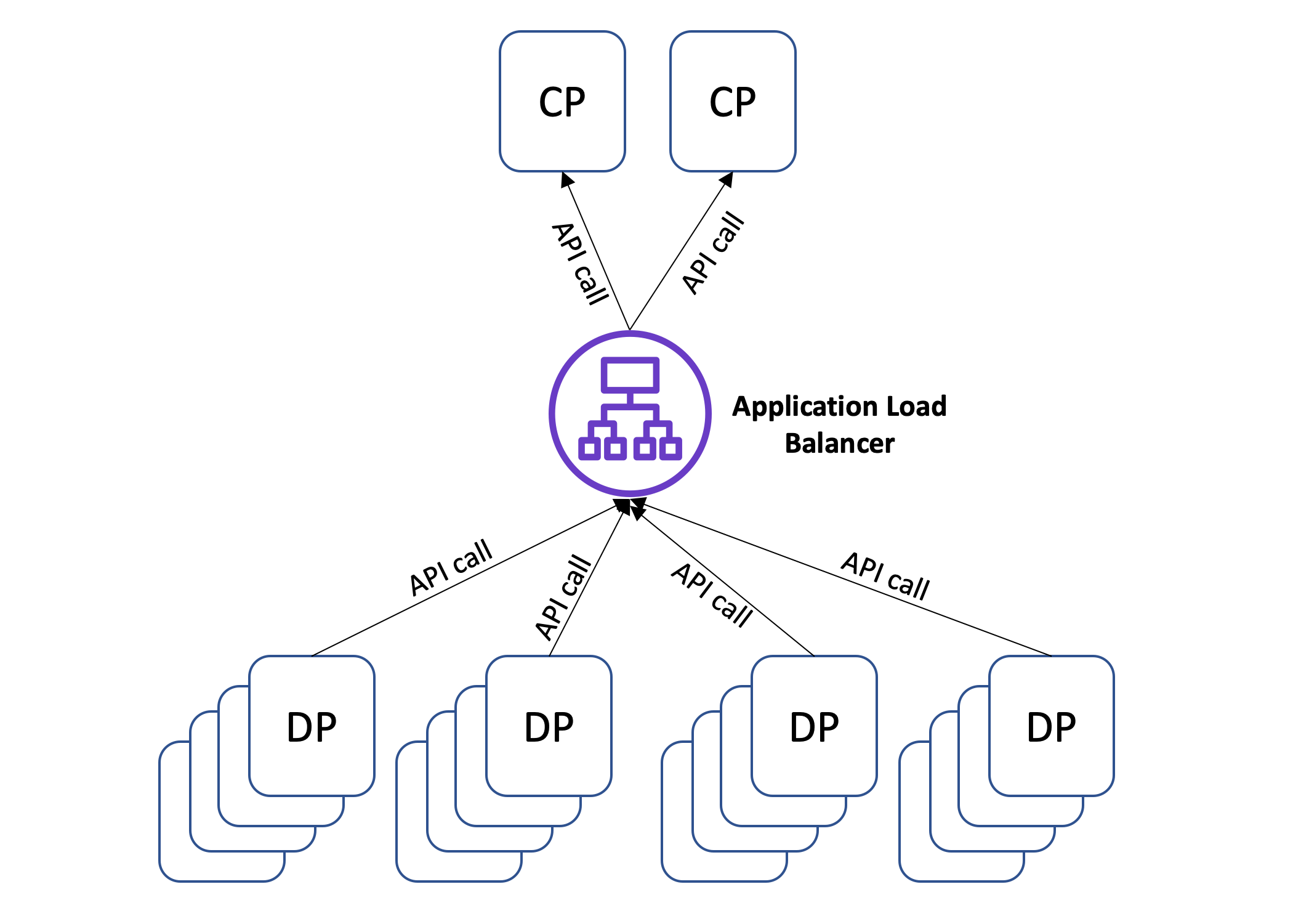 When building such architectures at Amazon, one of the decisions we carefully consider is the direction of API calls. Should the larger data plane fleet call the control plane fleet? Or should the smaller control plane fleet call the data plane fleet? For many systems, having the data plane fleet call the control plane tends to be the simpler of the two approaches. In such systems, the control plane exposes APIs that can be used to retrieve configuration updates and to push operational state. The data plane servers can then call those APIs either periodically or on demand. Each data plane server initiates the API request, so the control plane does not need to keep track of the data plane fleet. For each request, a control plane server responds with updated configuration (usually by querying its durable data store), and then forgets about it. To provide fault tolerance and horizontal scalability, control plane servers are placed behind a load balancer like Application Load Balancer. This is one of the simpler types of distributed systems to build, and it’s illustrated by the following diagram.