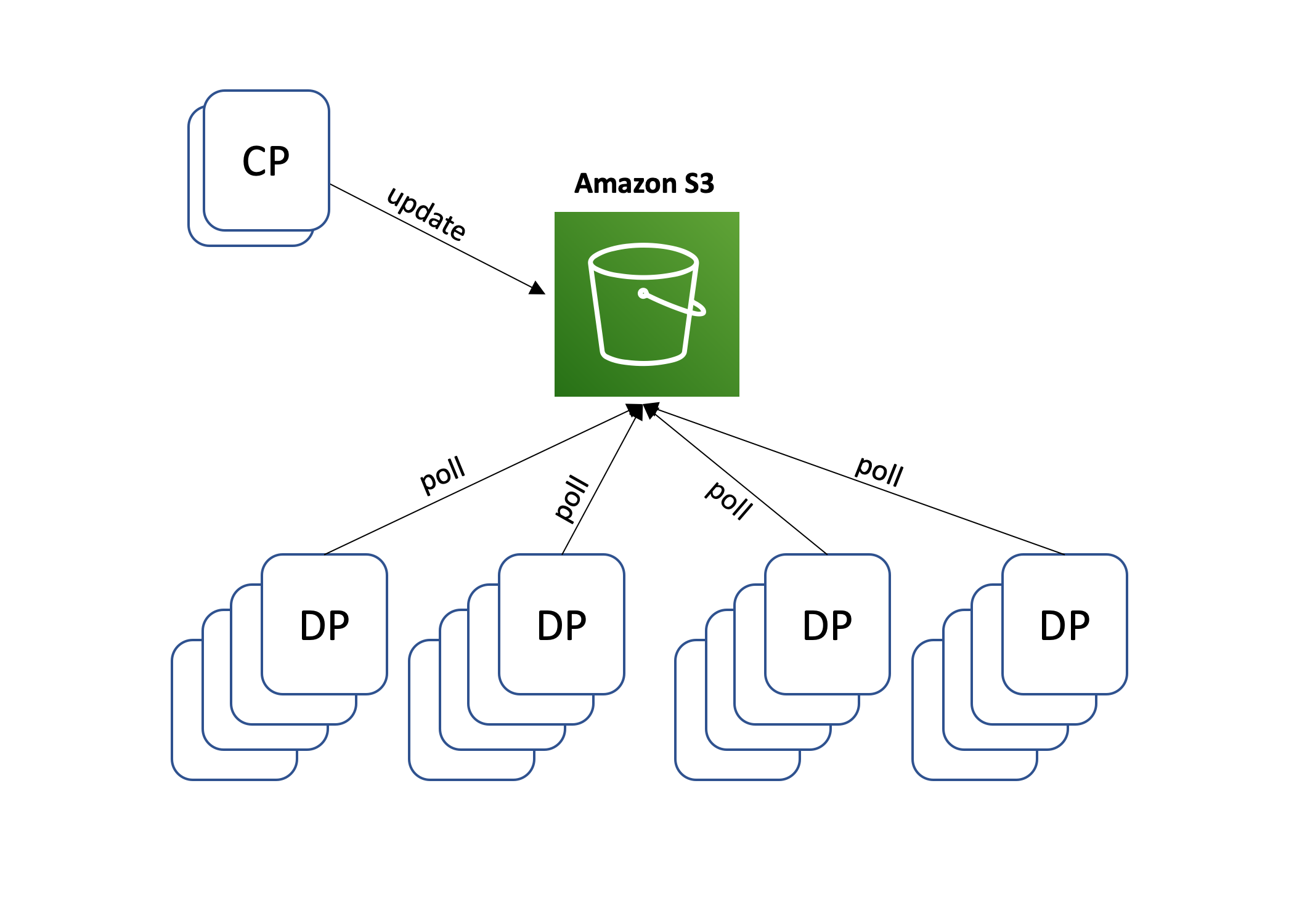 In other systems, it’s important for changes in the control plane configuration to be reflected in the data plane in single digit seconds or faster. An example of this situation is a container service that notifies a server about a new container it needs to run. In such systems, polling periodically updated files in Amazon S3 can make it impossible to achieve acceptable propagation latencies.